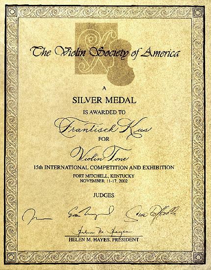 Diploma, 1st place, the 3rd International Violin-Making Festival of Vecenslav Metelka in Nachod (2008)